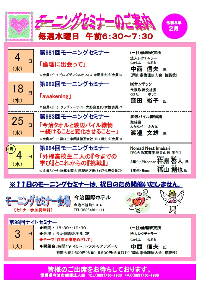 2月3日(火)ナイトセミナー及び4日(水)モーニングセミナーについて